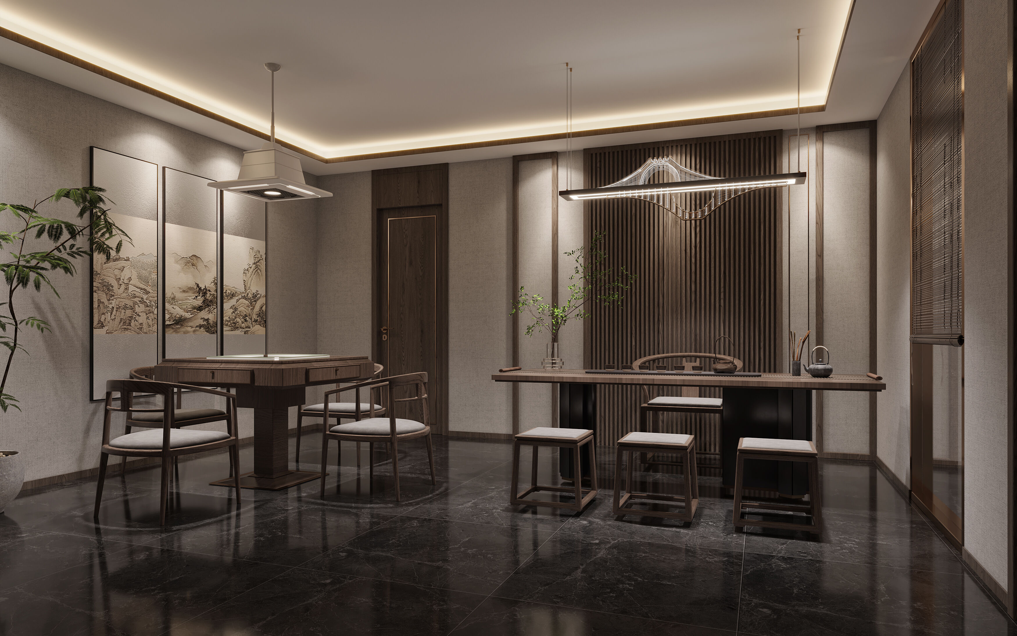 外間休閑區域,環境優雅僻靜;在休息時可以在落地窗前眺望風景,或者與兩三好友與茶臺旁聊一聊彼此近況,談一談大夢人生;在輕松愜意的環境中,放下塵囂,添些閑適,清水煮茶,偷這半世浮生。