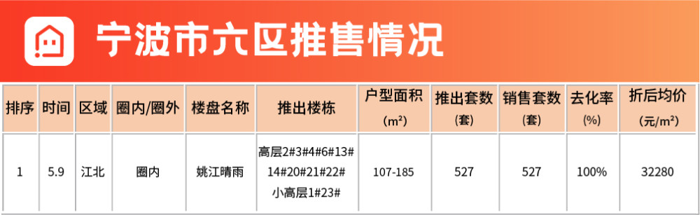 上周僅一個項目加推,為江北的姚江晴雨。項目位于姚江新城板塊,賣點主要以姚江新城地段及未來規(guī)劃,近軌交4號線(洪塘中路站),一線臨江,世外學校教育資源,內(nèi)部商業(yè)配套,價格倒掛優(yōu)勢為主,去化率100%。