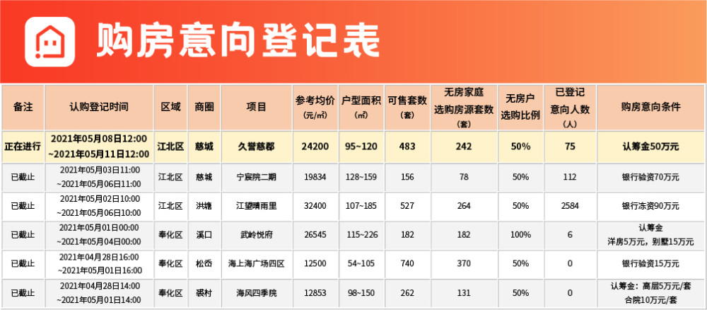 上周,共有6盤確定認籌,除去已于前日(5月9日)開盤的姚江晴雨外,本周還將迎來5個項目入市,但從目前的意向登記人數(shù)來看,堪稱慘淡,其中江北慈城的久譽慈郡和寧宸院二期都是由圈外晉升到圈內(nèi)的項目,稀缺的房票也讓原先一大批懷抱投資需求的主城區(qū)剛需外溢客戶“有心無力”。
