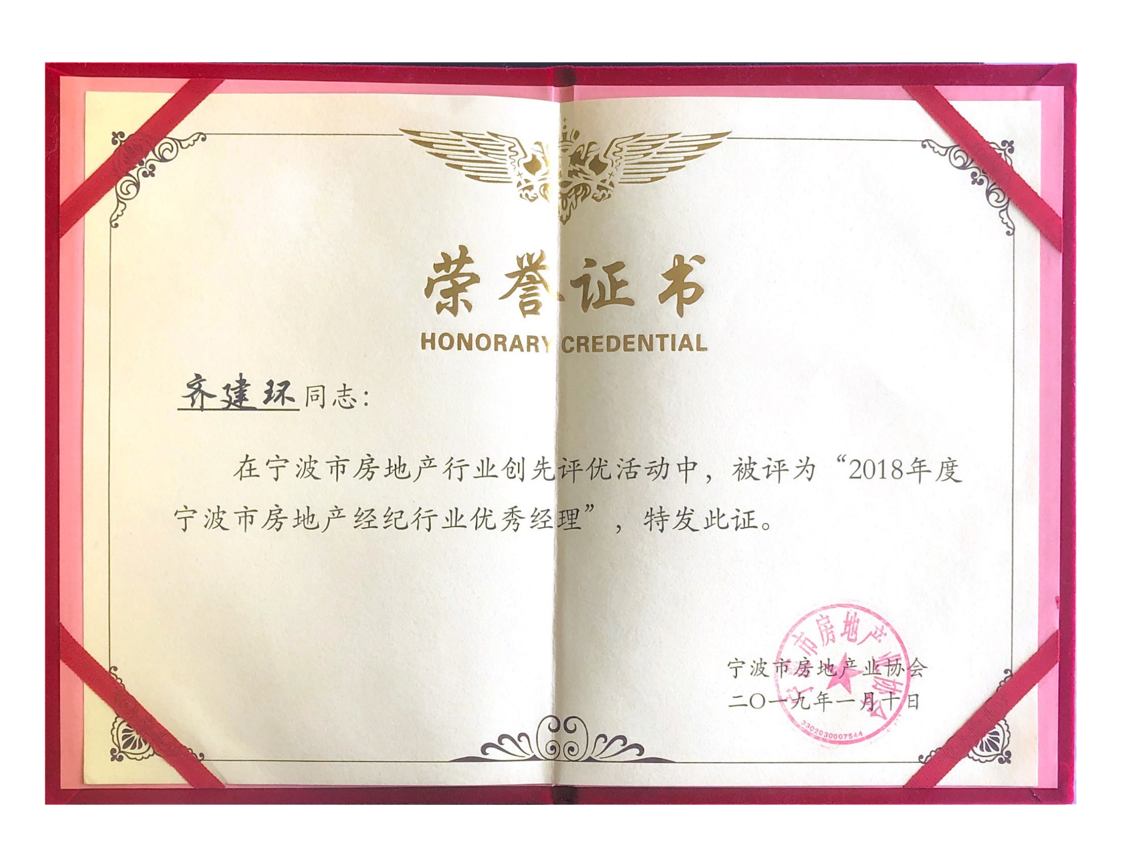 齊建環先生榮獲2018年度寧波市房地產經紀行業優秀經理